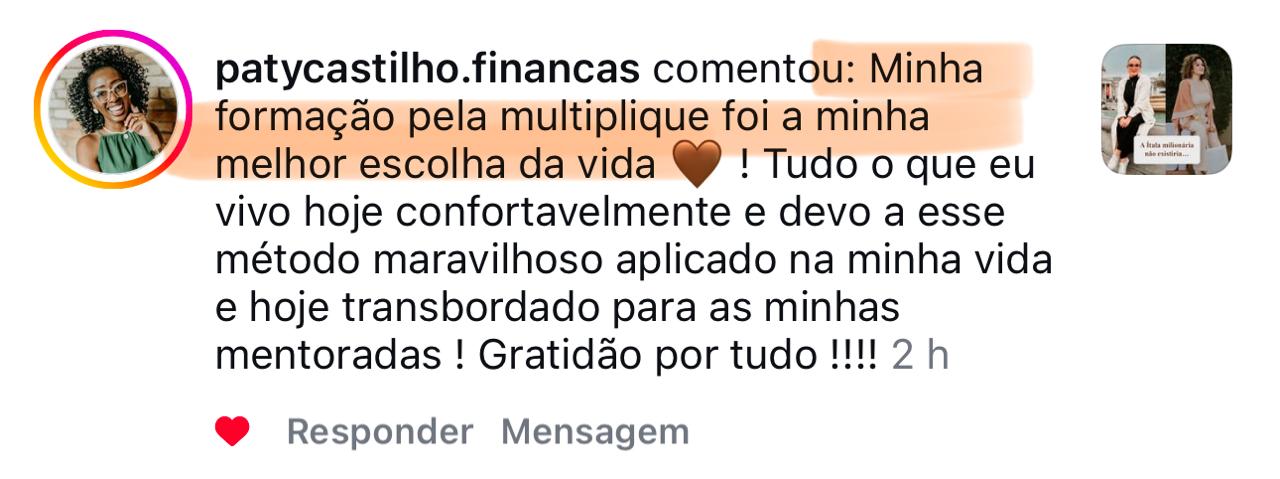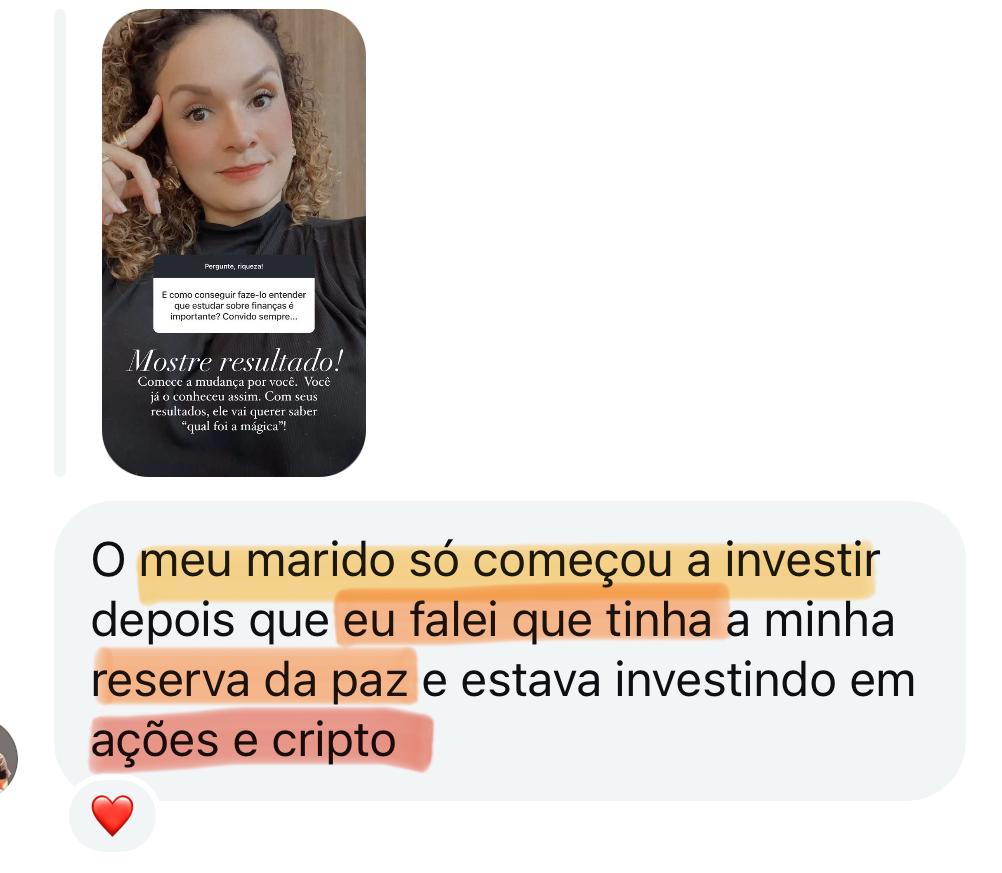 AVISO LEGAL: Rentabilidade passada não representa garantia de rentabilidade futura. Não considere as informações acima como indicações de investimentos. Os resultados indicados acima são meus resultados pessoais e de minhas alunas. Não há garantia que você terá os mesmos mesmos resultados. Seus resultados variam e dependem de muitos fatores, incluindo, mas não se limitando a, sua formação, experiência e ética de trabalho. Todos os investimentos envolvem riscos.
