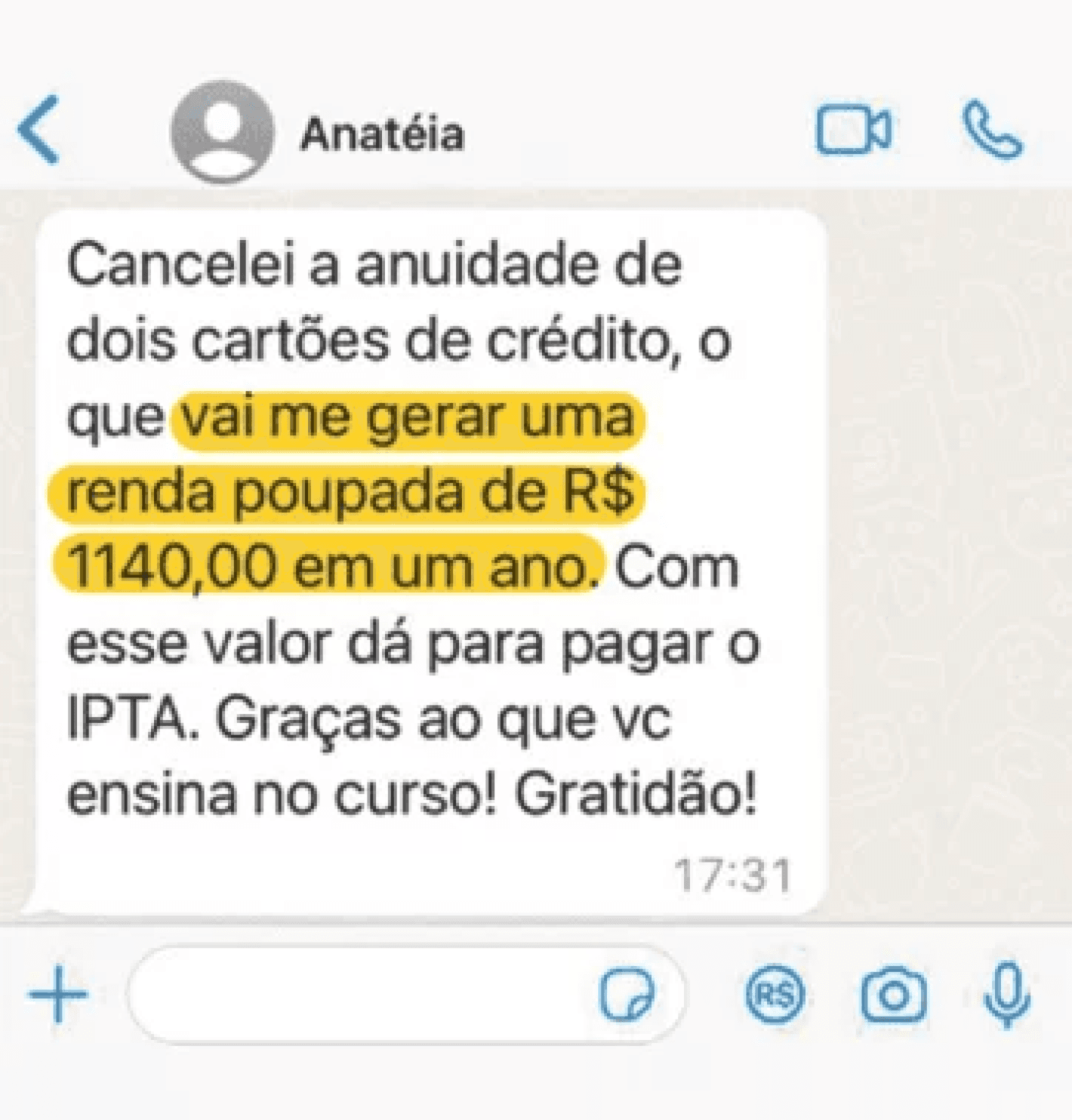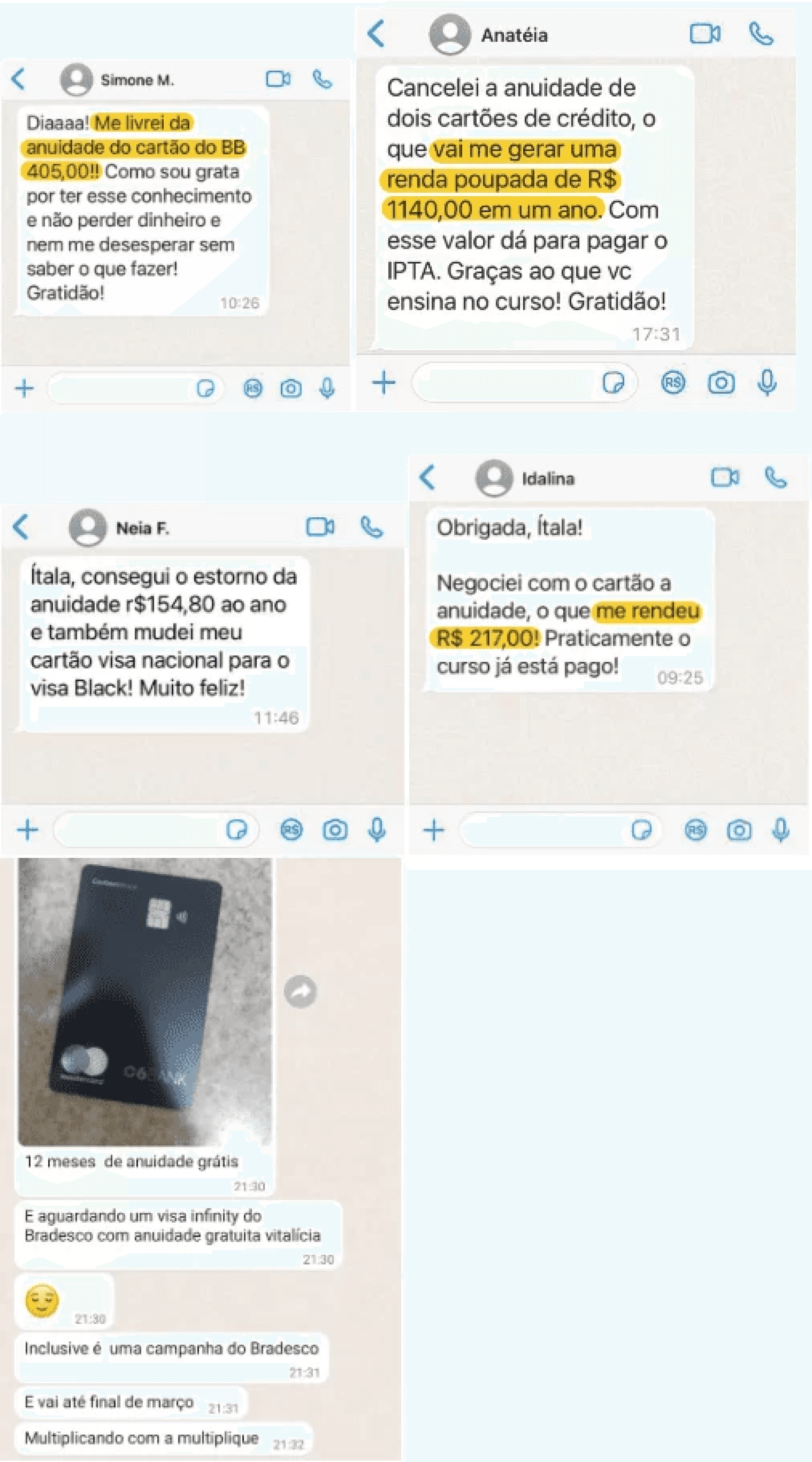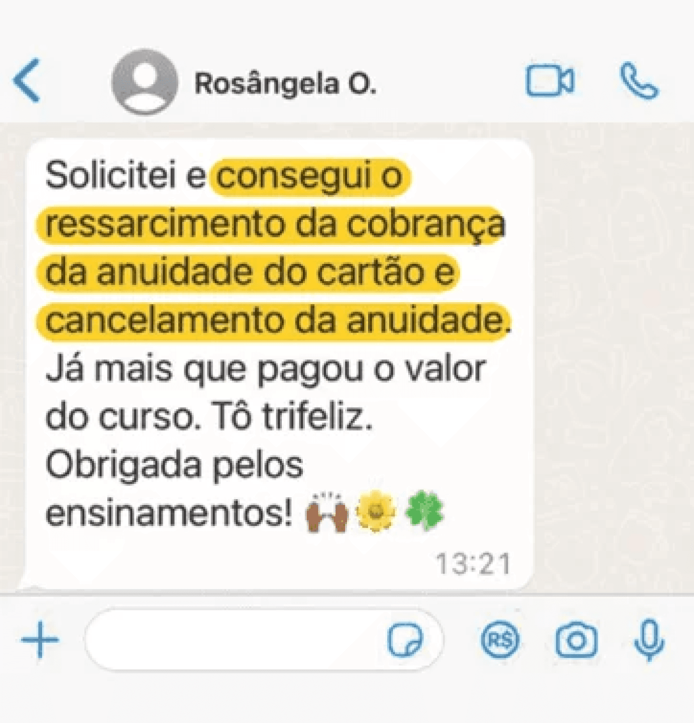 Segundamente: você percebeu que as alunas conseguem muitos feitos, certo? Mas na verdade, você precisa APENAS de uma anuidade cancelada ou um mês de cashback das suas compras que seu investimento na imersão já se paga, muitas vezes, mais de uma vez o valor da vaga – ou seja você tem LUCRO!