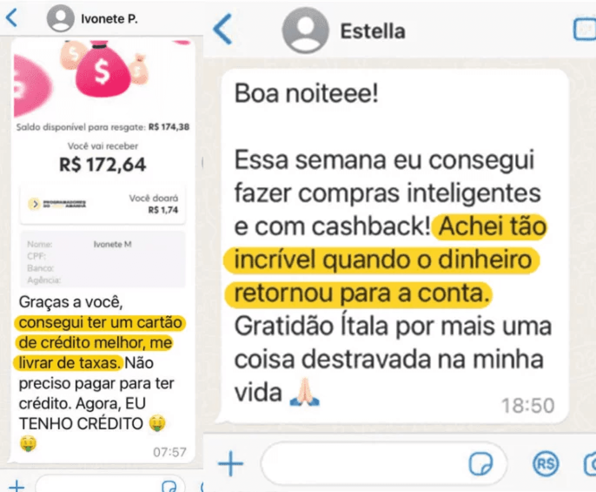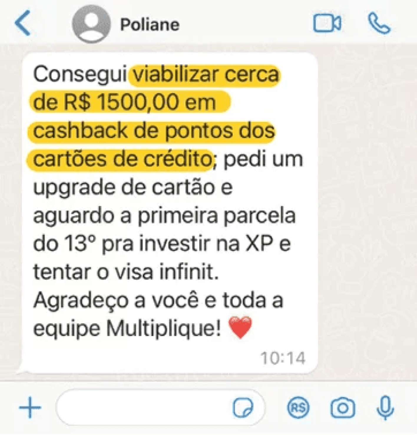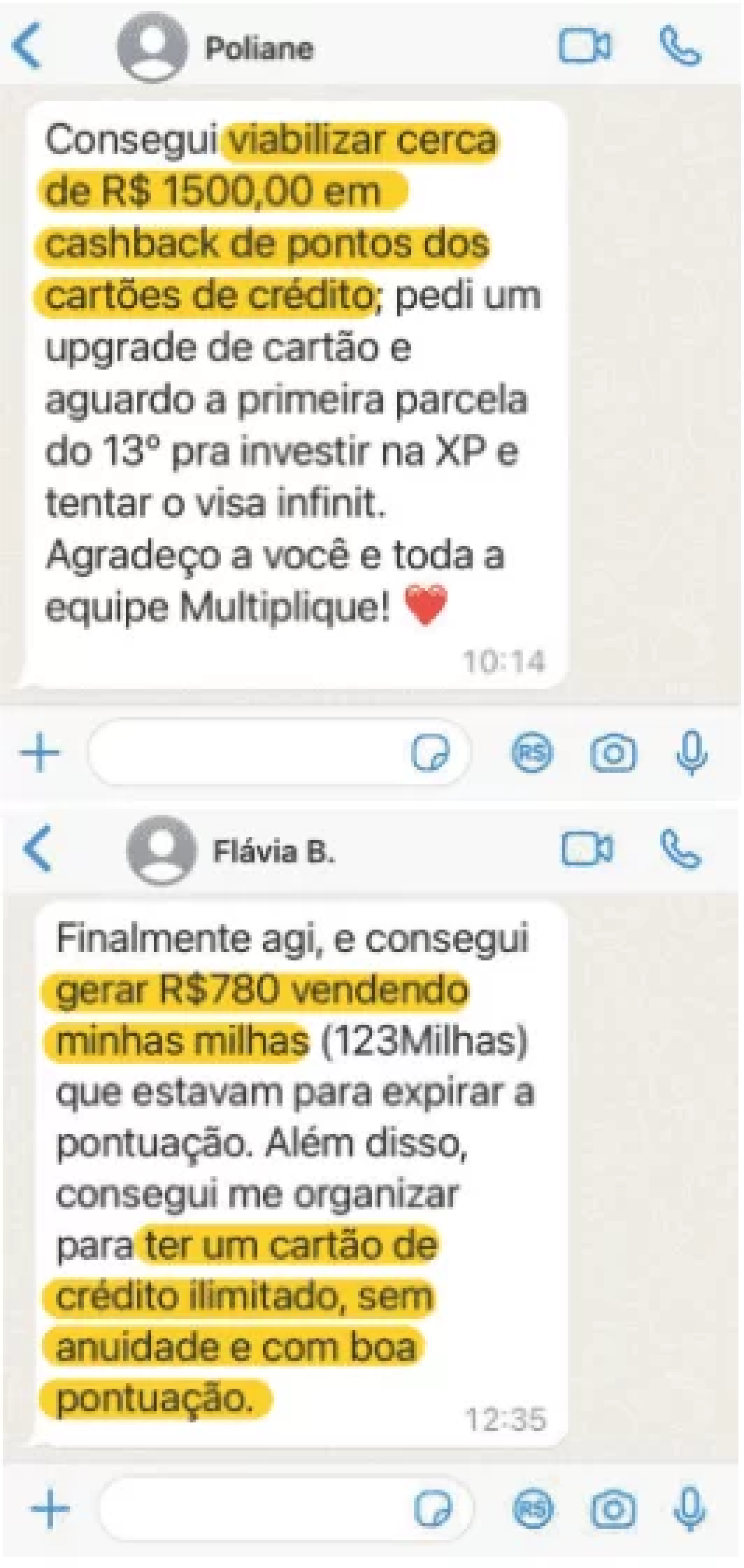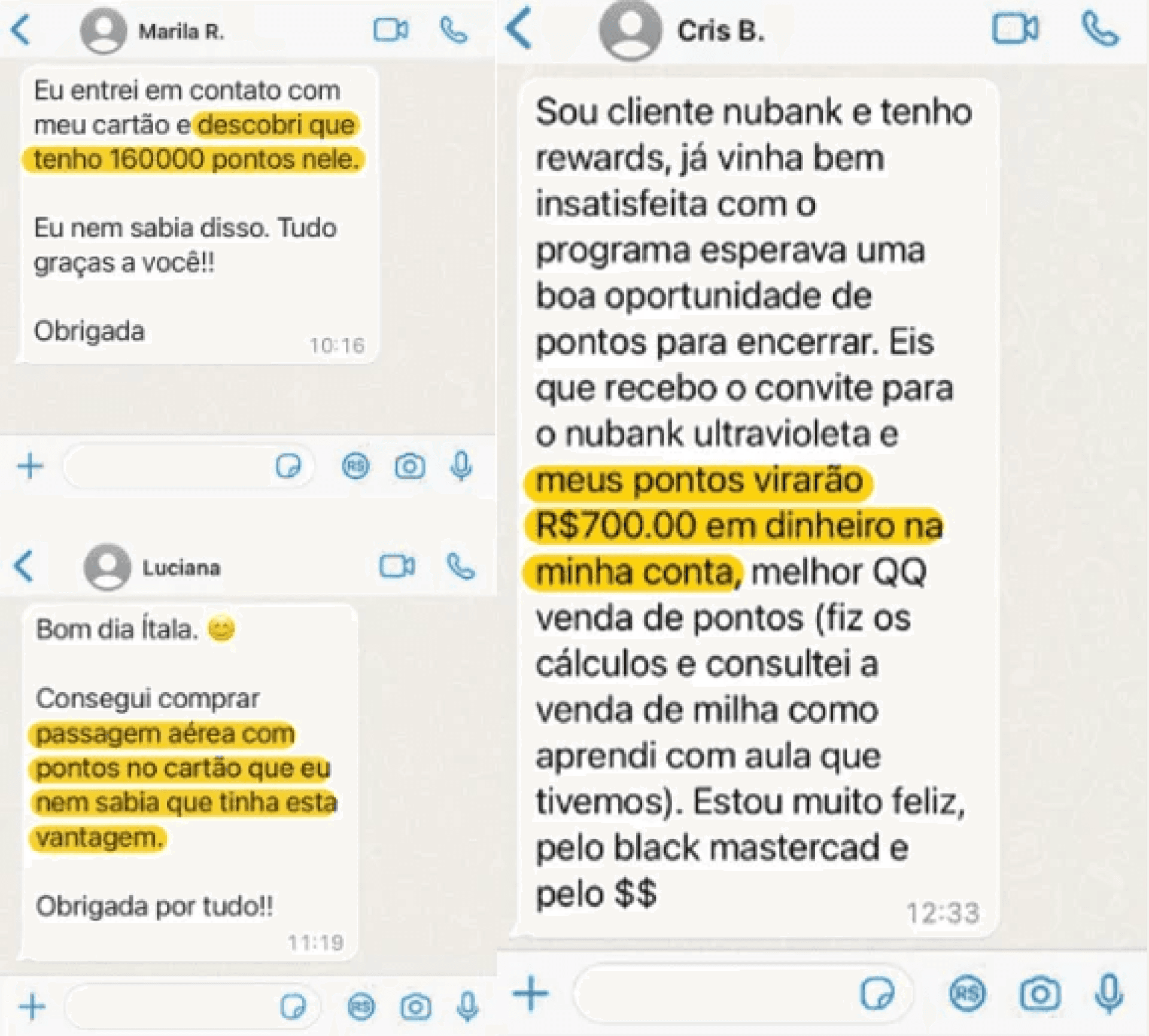 Segundamente: você percebeu que as alunas conseguem muitos feitos, certo? Mas na verdade, você precisa APENAS de uma anuidade cancelada ou um mês de cashback das suas compras que seu investimento na imersão já se paga, muitas vezes, mais de uma vez o valor da vaga – ou seja você tem LUCRO!
