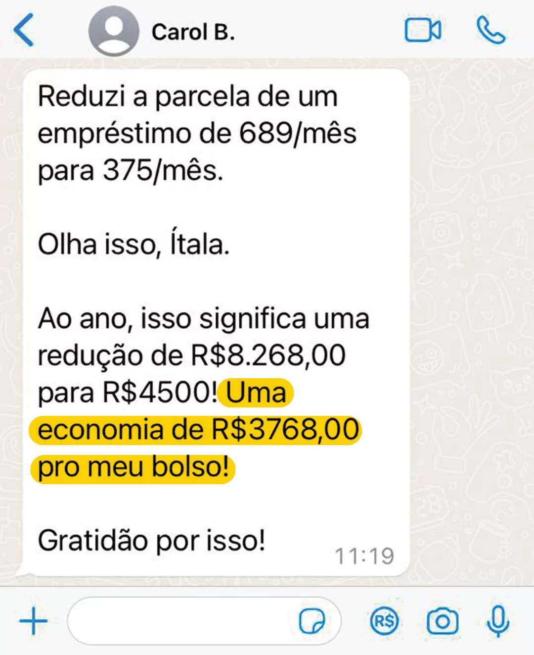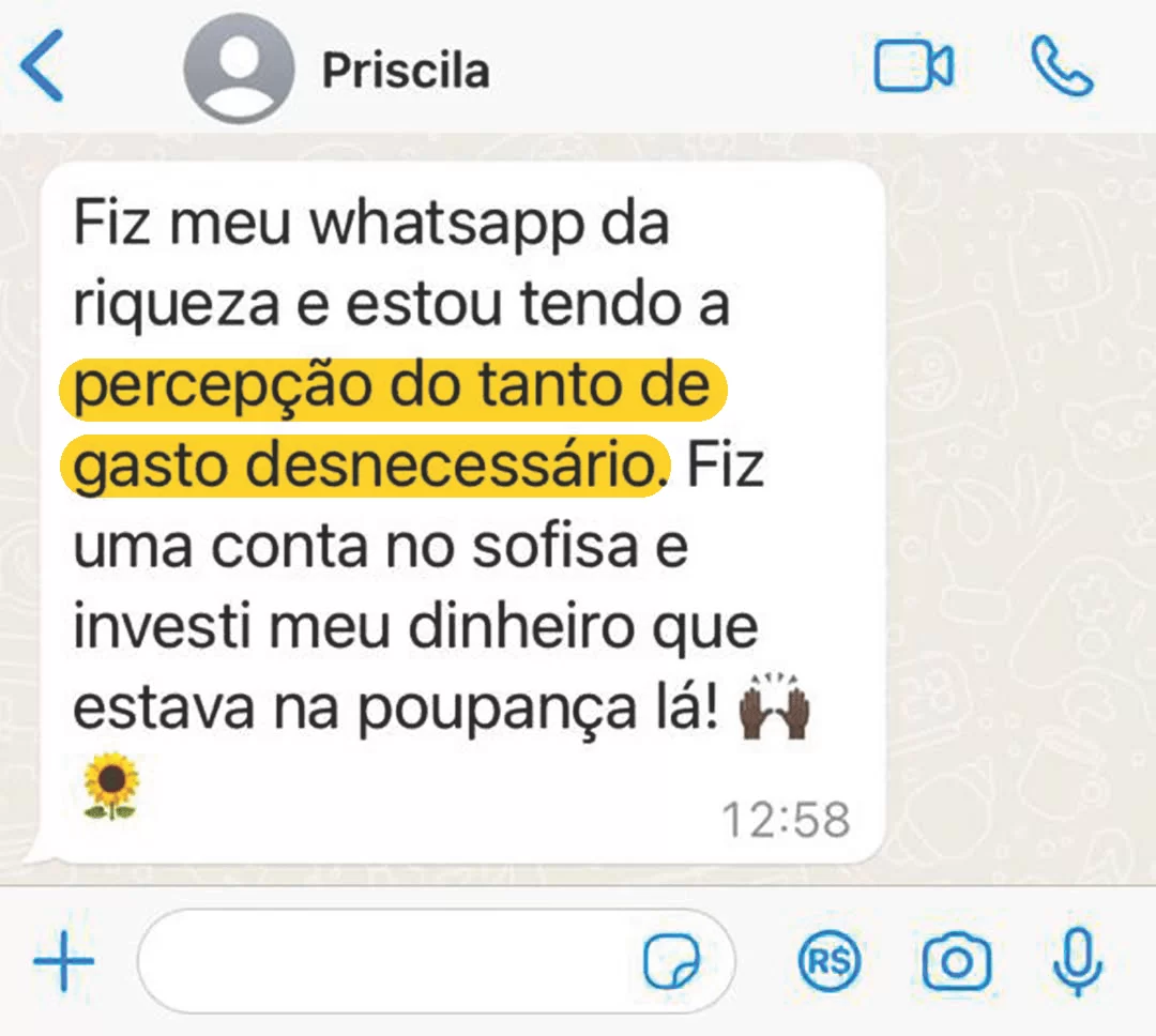 Durante o ciclo de 12 semanas, você receberá semanalmente em seu whatsapp o cronograma da semana para que você conquiste a sua liberdade financeira em em pouco tempo.