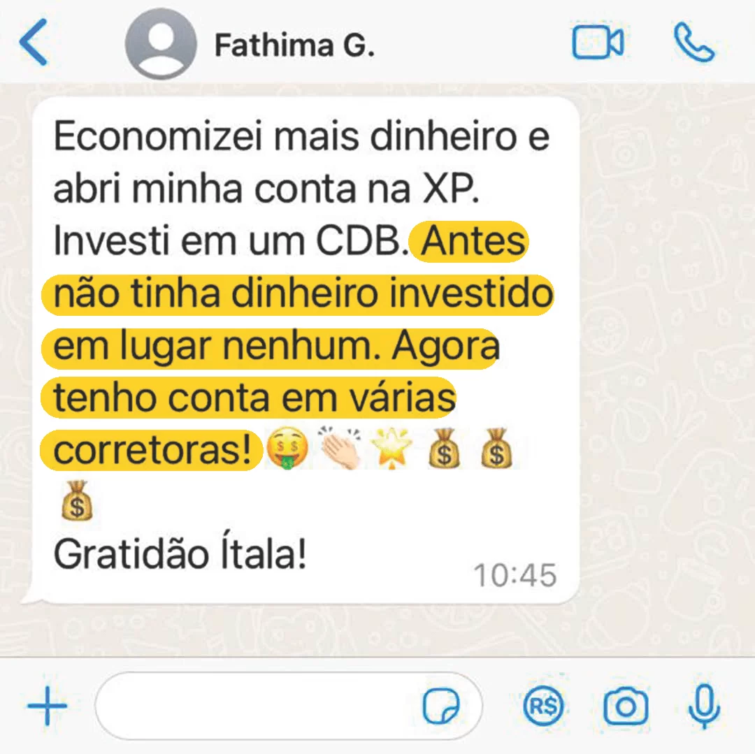 AVISO LEGAL: Rentabilidade passada não representa garantia de rentabilidade futura. Não considere as informações acima como indicações de investimentos. Os resultados indicados acima são meus resultados pessoais e de minhas alunas. Não há garantia que você terá os mesmos mesmos resultados. Seus resultados variam e dependem de muitos fatores, incluindo, mas não se limitando a, sua formação, experiência e ética de trabalho. Todos os investimentos envolvem riscos.
