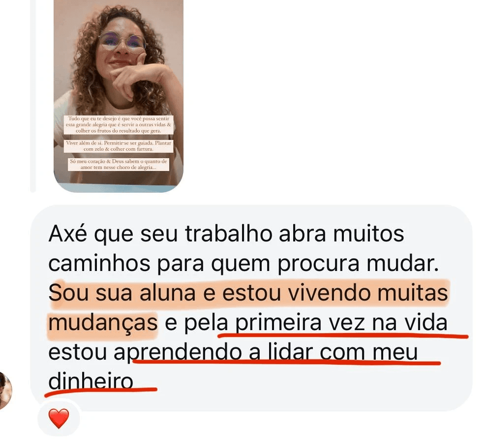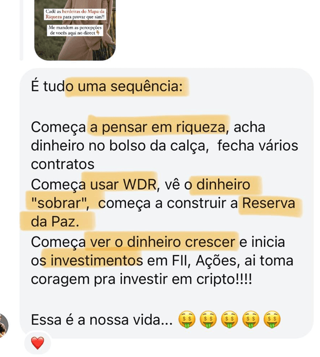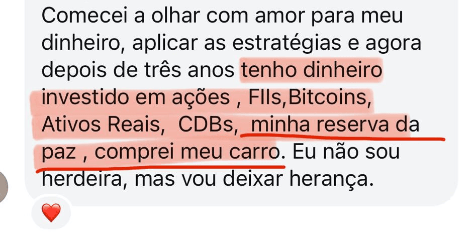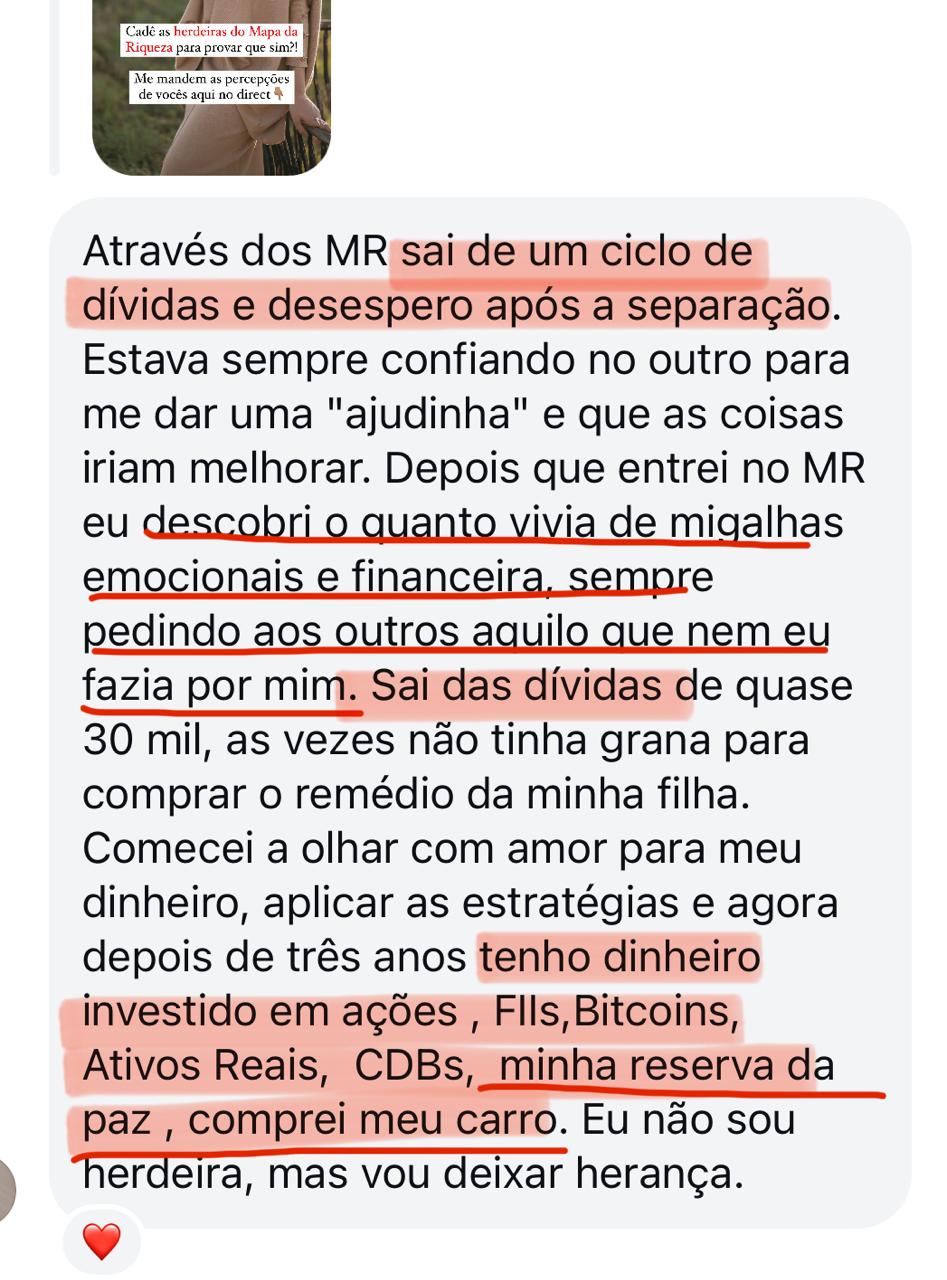 "Cada fase do Mapa da Riqueza é um pedaço da minha própria história. Eu vivi cada uma delas. Se eu consegui, e se +12.000 mulheres depois de mim conseguiram, você também consegue."