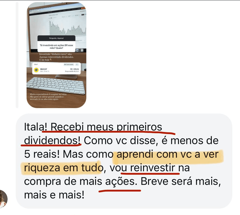 "Recebi meus primeiros dividendos. Vou reinvestir na compra de mais ações! Breve será mais!"