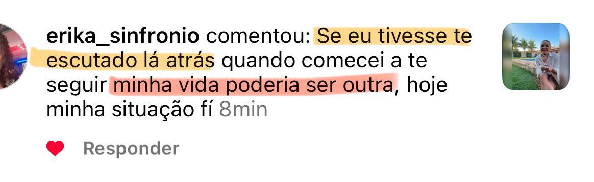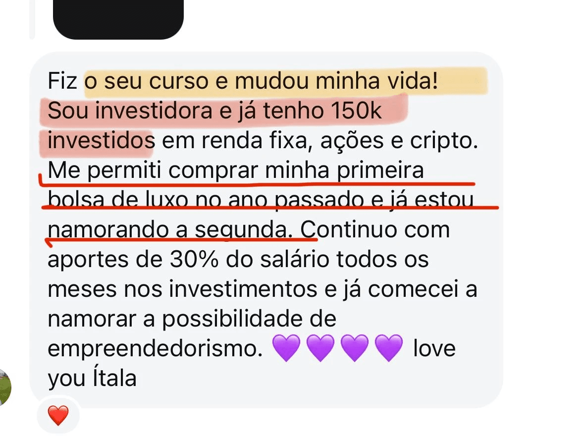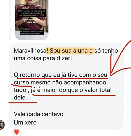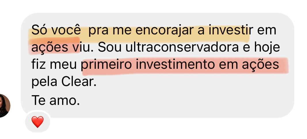 AVISO LEGAL: Rentabilidade passada não representa garantia de rentabilidade futura. Não considere as informações acima como indicações de investimentos. Os resultados indicados acima são meus resultados pessoais e de minhas alunas. Não há garantia que você terá os mesmos mesmos resultados. Seus resultados variam e dependem de muitos fatores, incluindo, mas não se limitando a, sua formação, experiência e ética de trabalho. Todos os investimentos envolvem riscos.