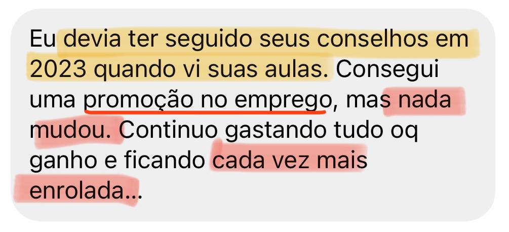 Opção 1: Fechar essa página e continuar fazendo o que sempre fez. Daqui a 12 meses, a situação vai ser a mesma, ou pior. A fatura vai continuar assustando. O dinheiro vai continuar sumindo. E a sensação de estar ficando para trás vai continuar crescendo.